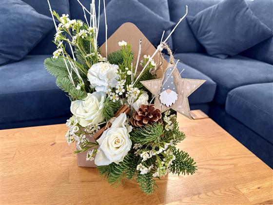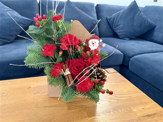 Flowers and foliage arranged in a unique envelope shaped box, includes a keepsake hanging Christmas decoration.