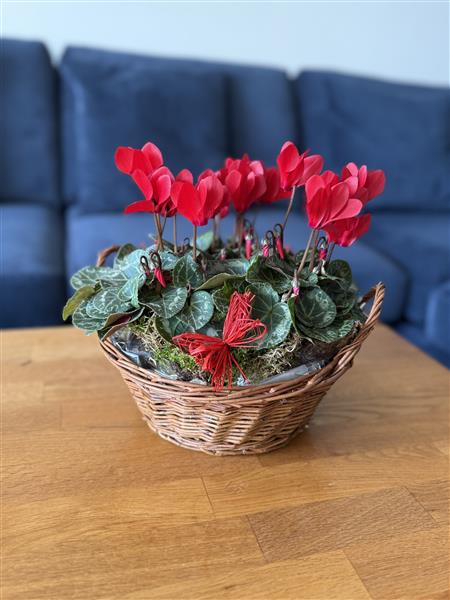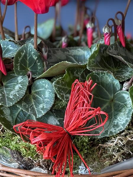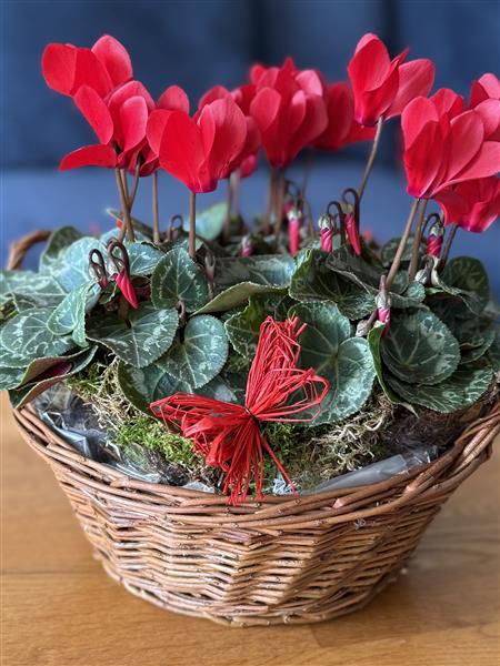 A really seasonal planter. A trio of Cyclamen plants, planted in a basket. Can go indoors for now, but the cyclamen can be planted outside later, and will come up every year.