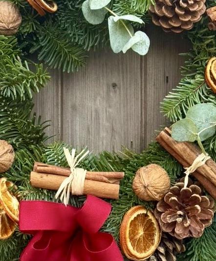 An 16 inch fresh blue pine door wreath decorated with orange slices, cinnamon sticks, walnuts, cones, and a pretty burgandy bow. A perfect, long lasting gift. Please note that two days notice are required when ordering.