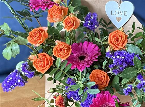 A vibrant selection of flowers in an envelope shaped container, includes a keepsake wooden heart shaped tag with the word "LOVE" on it.