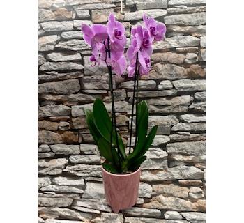 A graceful phalaenopsis orchid presented in a stylish china pot. (colour of pot and orchid may vary)
