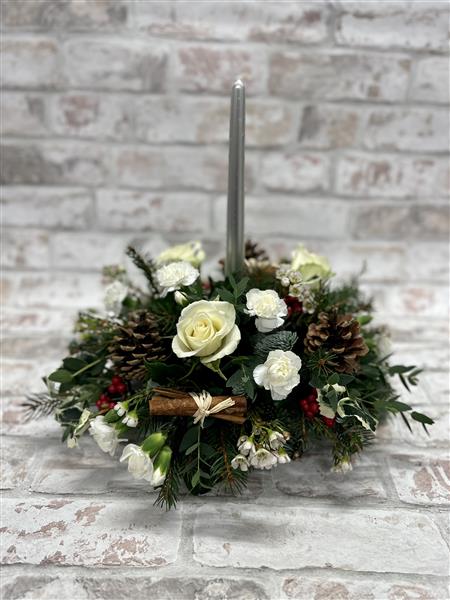 A minimalistic style candle table arrangement, elegant enough to grace any Christmas table. Including cinnamon sticks, pine cones, with Christmassy foliages like pine and holly.