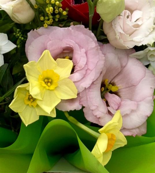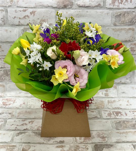 A joyous collection of spring flowers arranged in a box with water. Contents may vary depending on availabilty but will be a colourful mix.