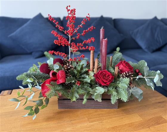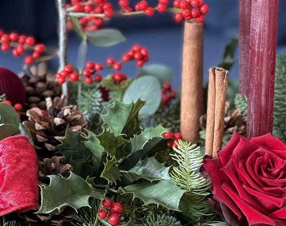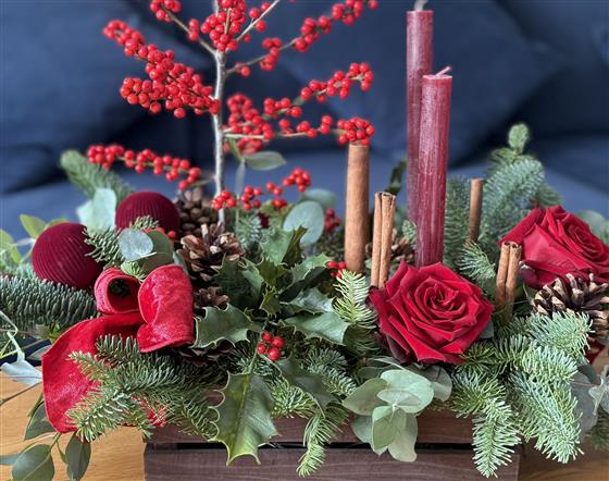 The perfect gift for the season, a luxurious arrangement with velvety red roses, berries, cones, scented blue pine, eucalyptus and cinnamon sticks, holly and candles, finished off with velvet ribbon and baubles.